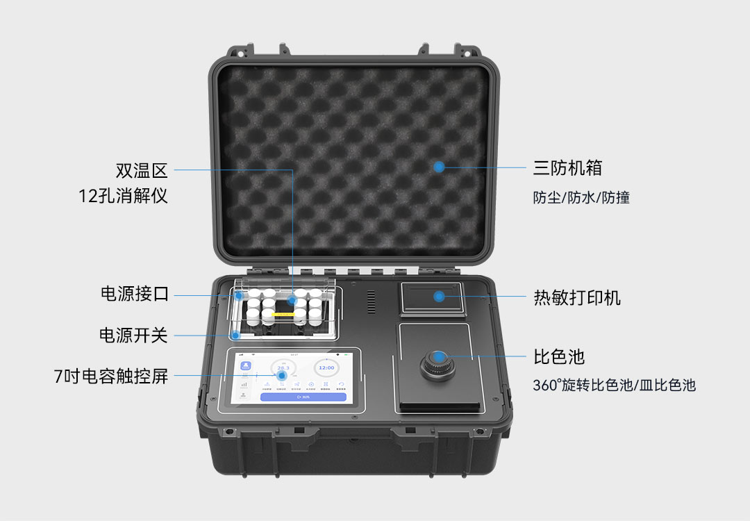 在本次技能競賽中使用的LH-C600便攜式多參數水質測定儀,是連華科技首款從單片機升級為安卓系統的儀器,集LHOS操作系統、360°旋轉管比色、雙比色系統、雙溫區消解、個性化定制、數據智能分析等多種新技術功能于一身,實現了水質檢測設備的多線程任務處理、多元化場景支持和流暢的用戶體驗,使水質檢測工作變得更加智能、精準和高效。儀器支持COD、氨氮、總磷、總氮、懸浮物、色度、濁度、重金屬、有機污染物和無機污染物等38項水質指標檢測,兼顧便利性的同時又不失實驗室型儀器的精確度。