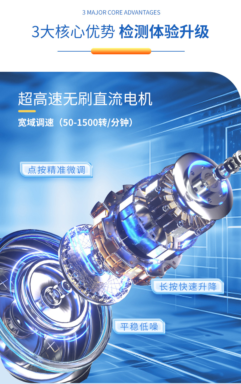 1、強勁動力,無極調速:50-1500轉/分鐘寬幅調速,點按精準調節,長按快速增減,操作更高效;