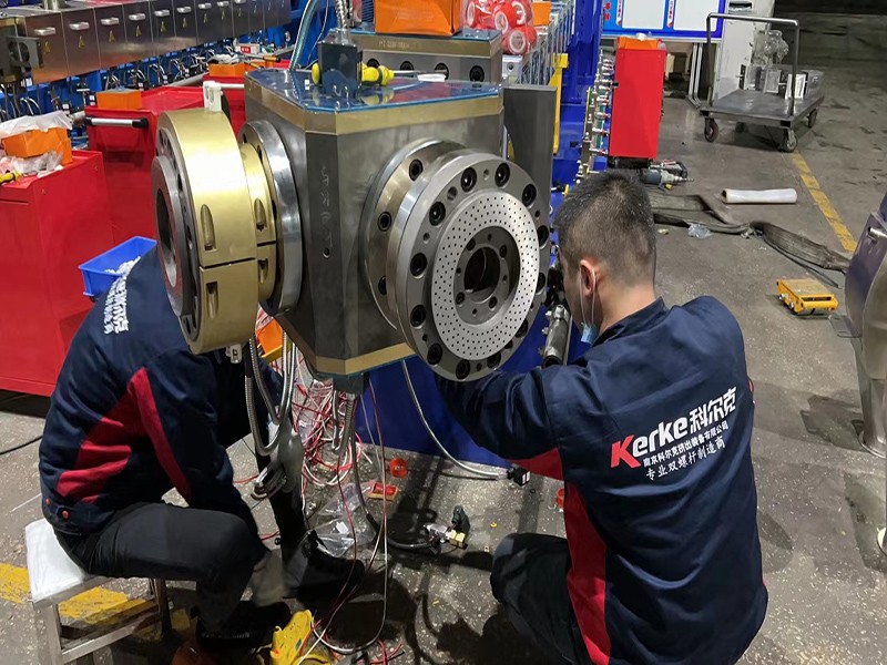 生產KTE-75D三螺桿鹽白填充母粒,一機雙切,產量為3000Kg/h。